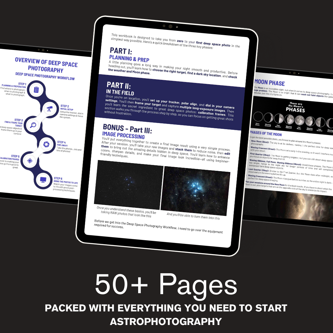 ✅ Complete Workflow — From Planning to Image Processing: 50+ pages that cover everything: location, setup, polar alignment, camera settings, shooting, and a bonus section to help you edit your final image.